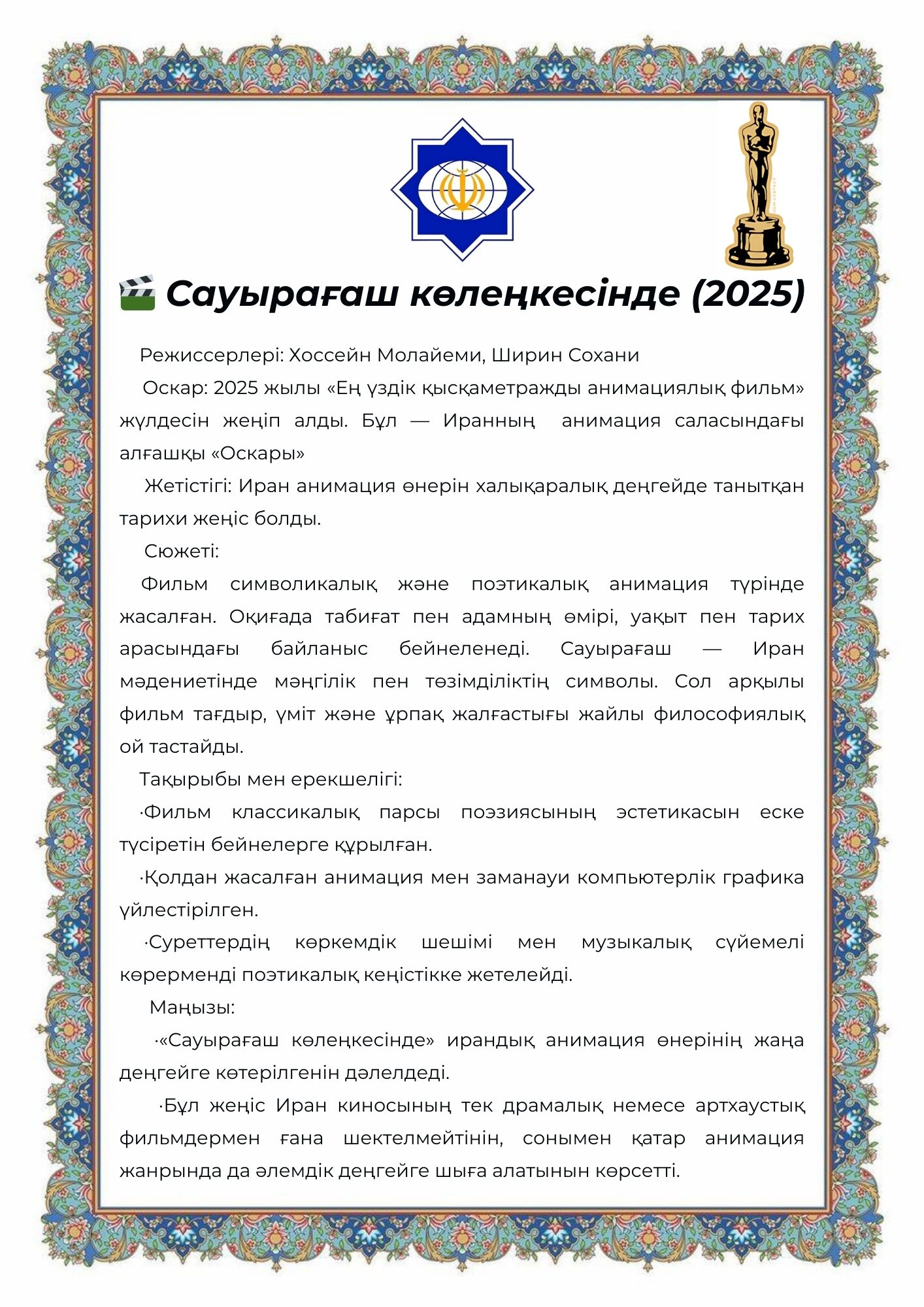 Ғылым ордасында Иран Ислам Республикасының Бас консулдығы мен Мәдени орталығының ұйымдастыруымен «Иран кино және өнері түні» мәдени іс-шарасы өтті.